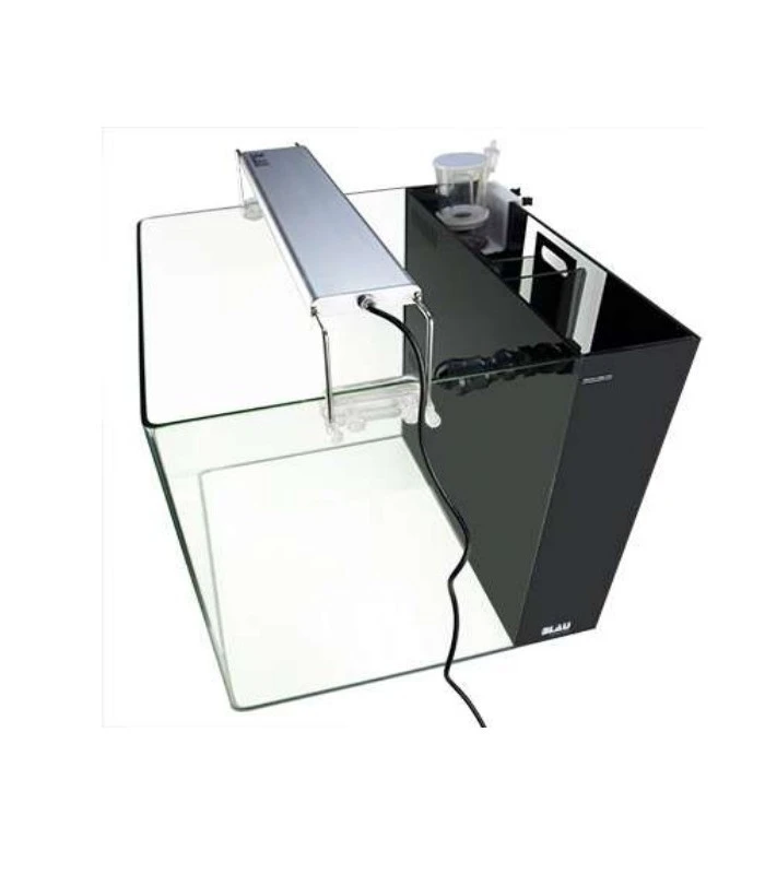 All-in-One 90-kitet från märket Blau Aquaristic är ett akvarium med filtrering baktill och belysning, med en version för sötvatten och en annan för saltvatten.